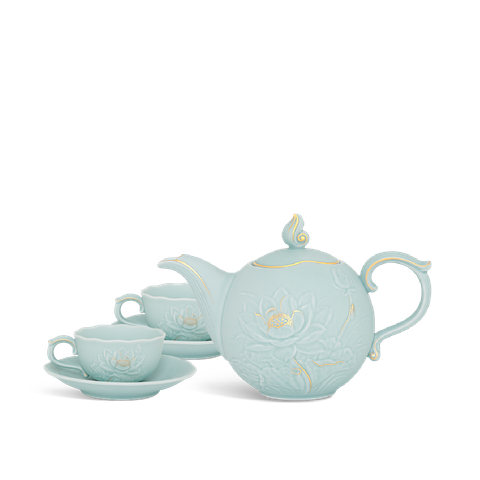 Bộ trà 0.7L – Sen – Men Ngọc Sương Mờ (Trang Trí Vàng) là sự kết hợp hoàn hảo giữa nghệ thuật gốm sứ truyền thống và vẻ đẹp sang trọng hiện đại. Họa tiết hoa sen thanh khiết được tô điểm bằng đường viền vàng trang nhã trên nền men ngọc sương mờ độc đáo, tạo nên một bộ trà mang đậm dấu ấn văn hóa Việt nhưng vẫn đầy tính thẩm mỹ và đẳng cấp.